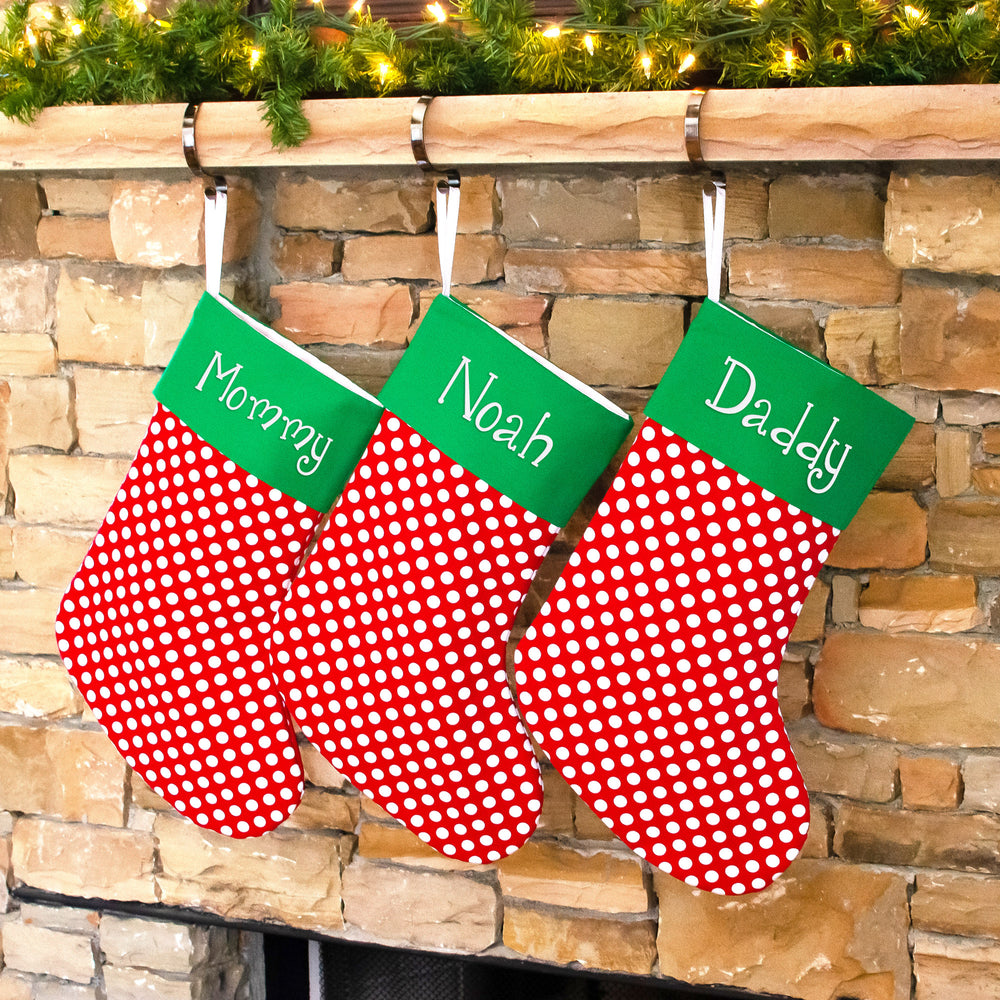 These traditional stockings with a red background, white polka dots and green cuff will hold lots of goodies for each member of the family. They will look festive hanging on your mantle!