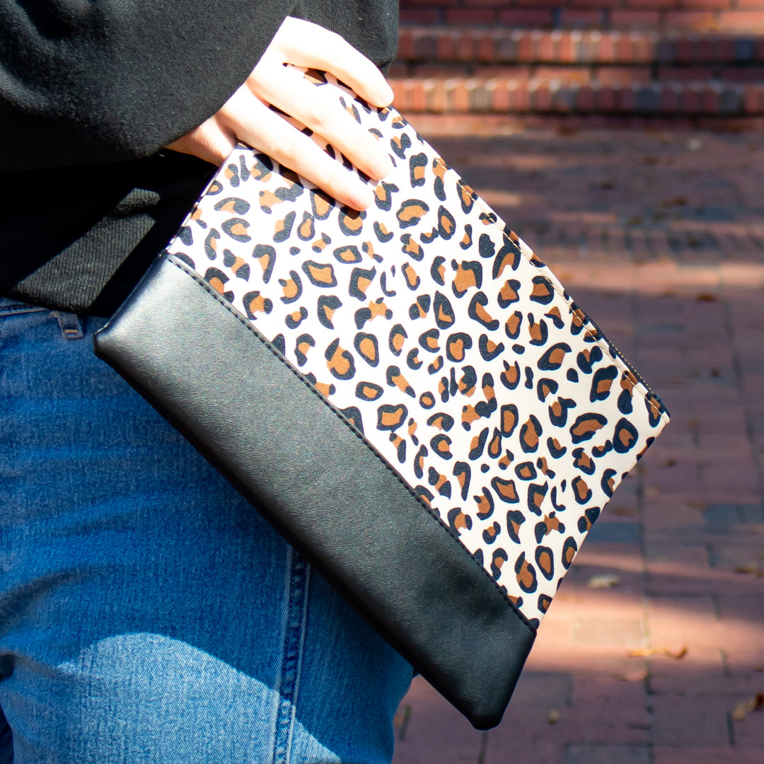 Animal print is in!!! Black faux leather adorns the lower portion of the bag and has also been fashioned into a long, flowing tassel style zipper pull. Finish the bag off with your favorite monogram design.